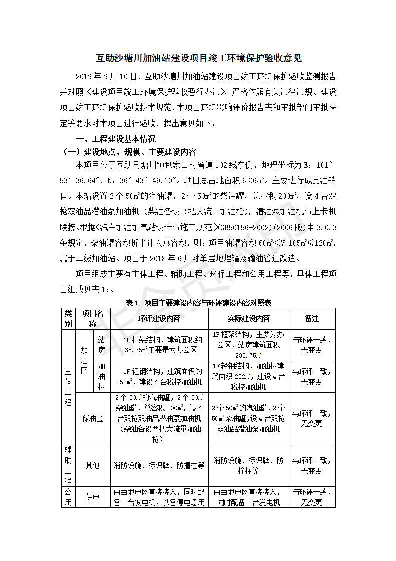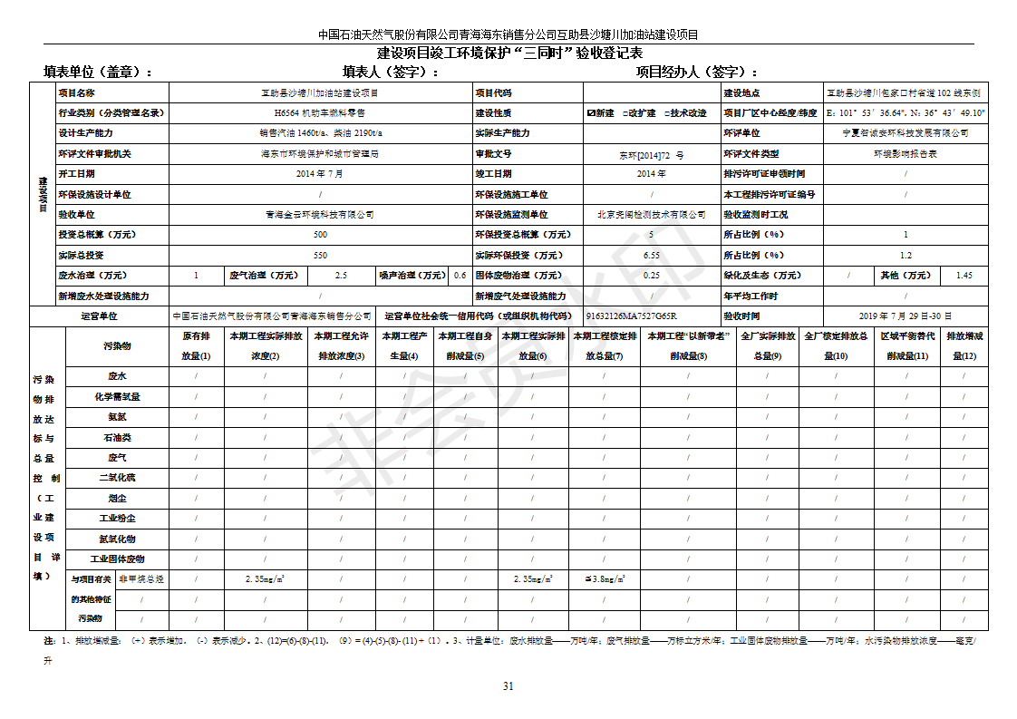 根據(jù)中華人民共和國國務院令第682號《國務院關于修改〈建設項目環(huán)境保護管理條例〉的決定》和《建設項目竣工環(huán)境保護驗收暫行辦法》(國務院令682號),互助縣沙塘川加油站建設項目(包括竣工環(huán)境保護驗收監(jiān)測報告表和驗收意見)公示如下。 一、項目名稱:互助縣沙塘川加油站建設項目 二、地點:互助縣塘川鎮(zhèn)包家口村 六、聯(lián)系電話:0971-6515411 七、公示時間:二〇一九年九月二十七日至二〇一九年十月二十九日 公示期間,對上述公示內容如有異議,請以書面形式反饋,個人須署真實姓名,單位須加蓋公章。