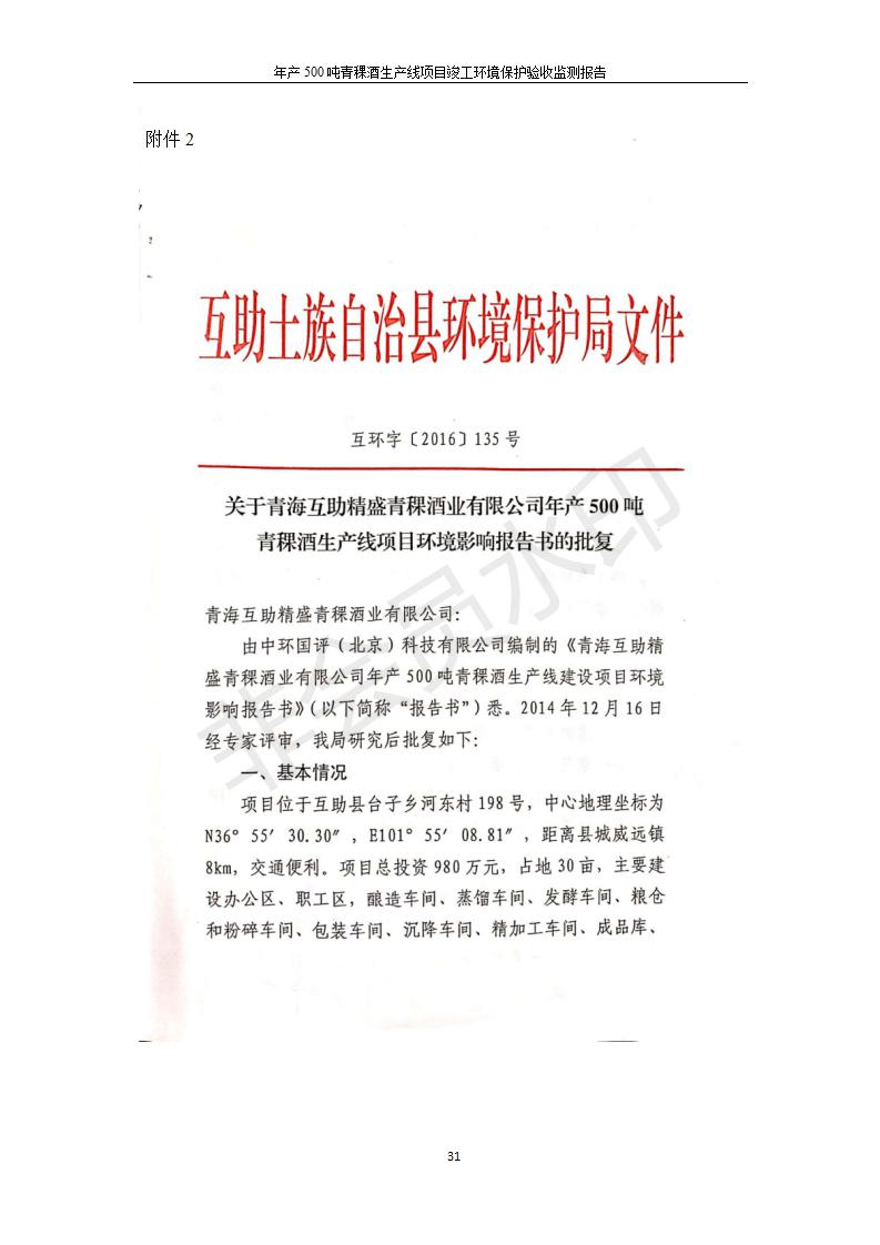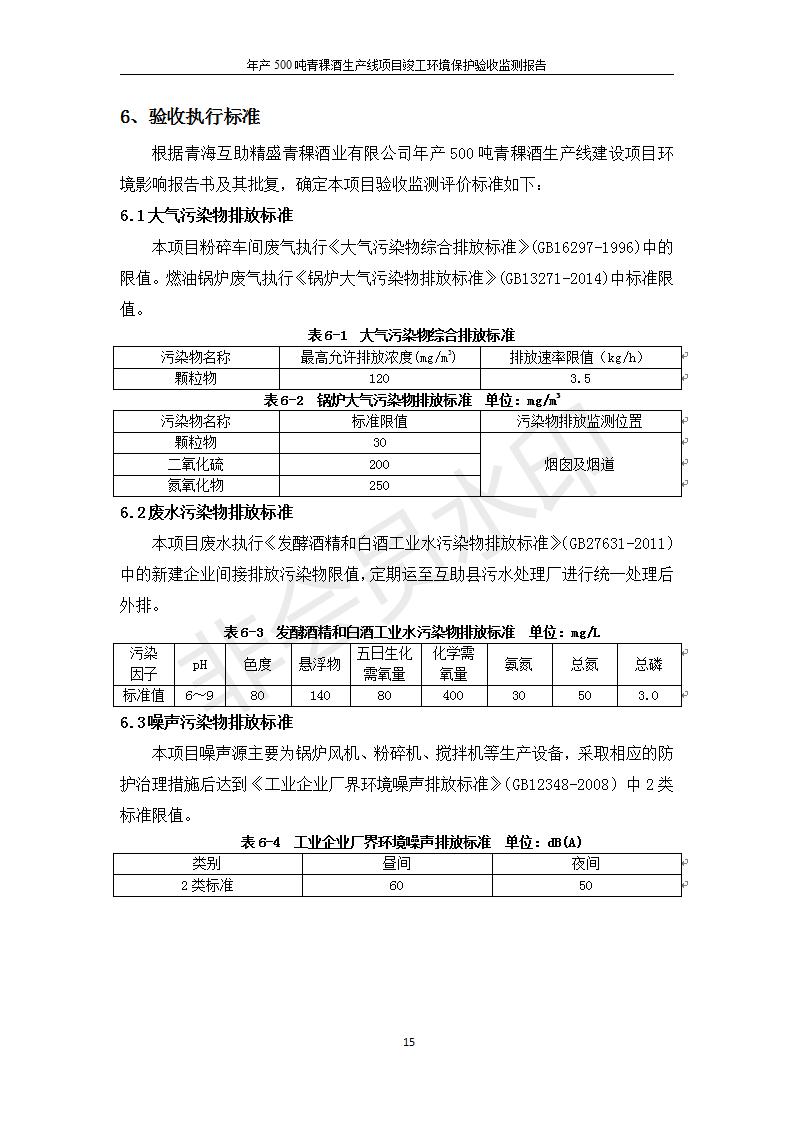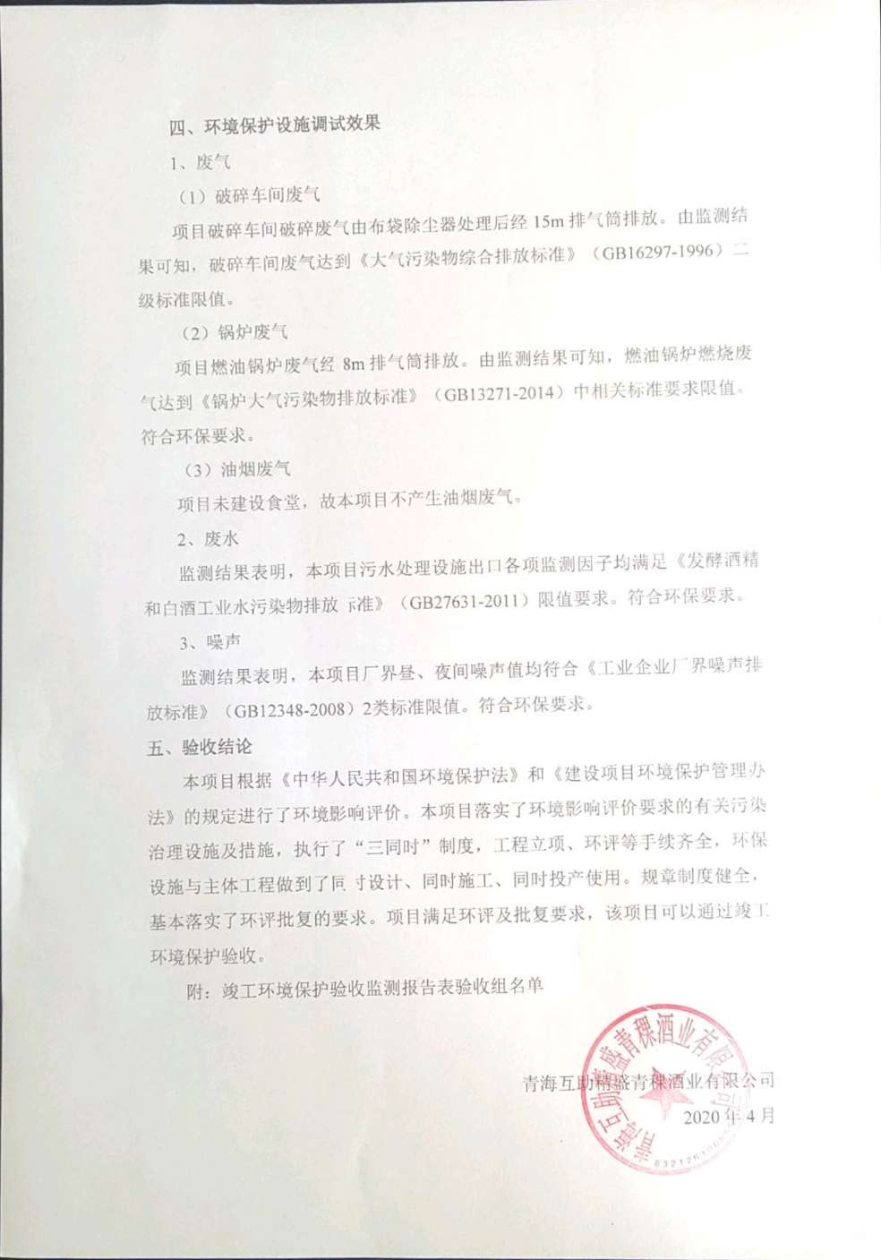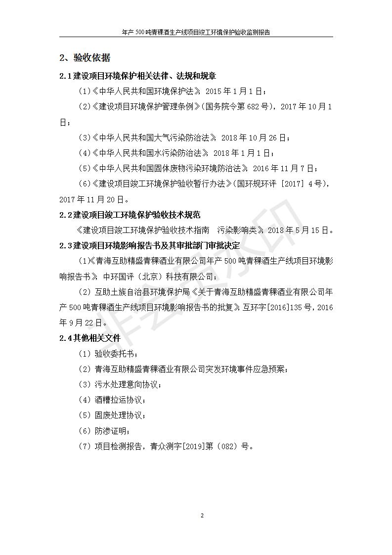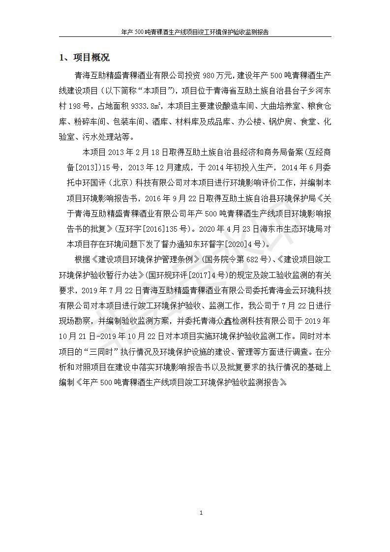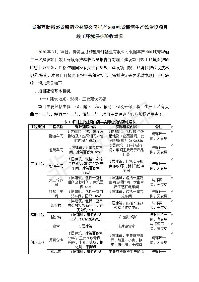 根據(jù)中華人民共和國國務(wù)院令第682號《國務(wù)院關(guān)于修改〈建設(shè)項目環(huán)境保護管理條例〉的決定》和《建設(shè)項目竣工環(huán)境保護驗收暫行辦法》(國務(wù)院令682號),綜合檢測實驗室建設(shè)項目(包括竣工環(huán)境保護驗收監(jiān)測報告表和驗收意見)公示如下。 一、項目名稱:青海互助精盛青稞酒業(yè)有限公司年產(chǎn)500噸青稞酒業(yè)生產(chǎn)線建設(shè)項目 二、地點:青海省海東市互助土族自治縣臺子鄉(xiāng)河?xùn)|村198號