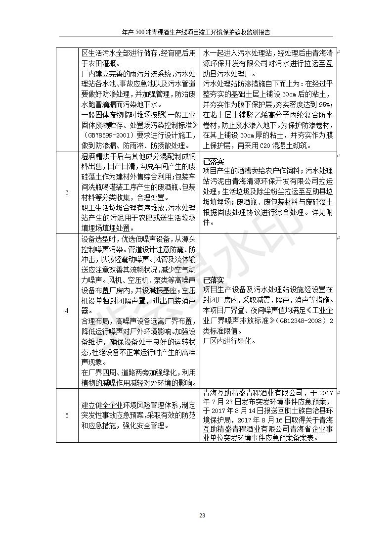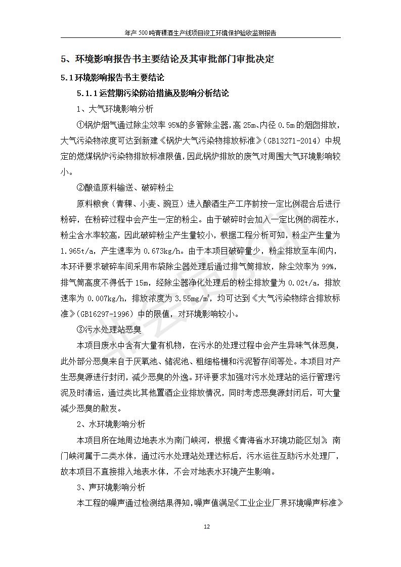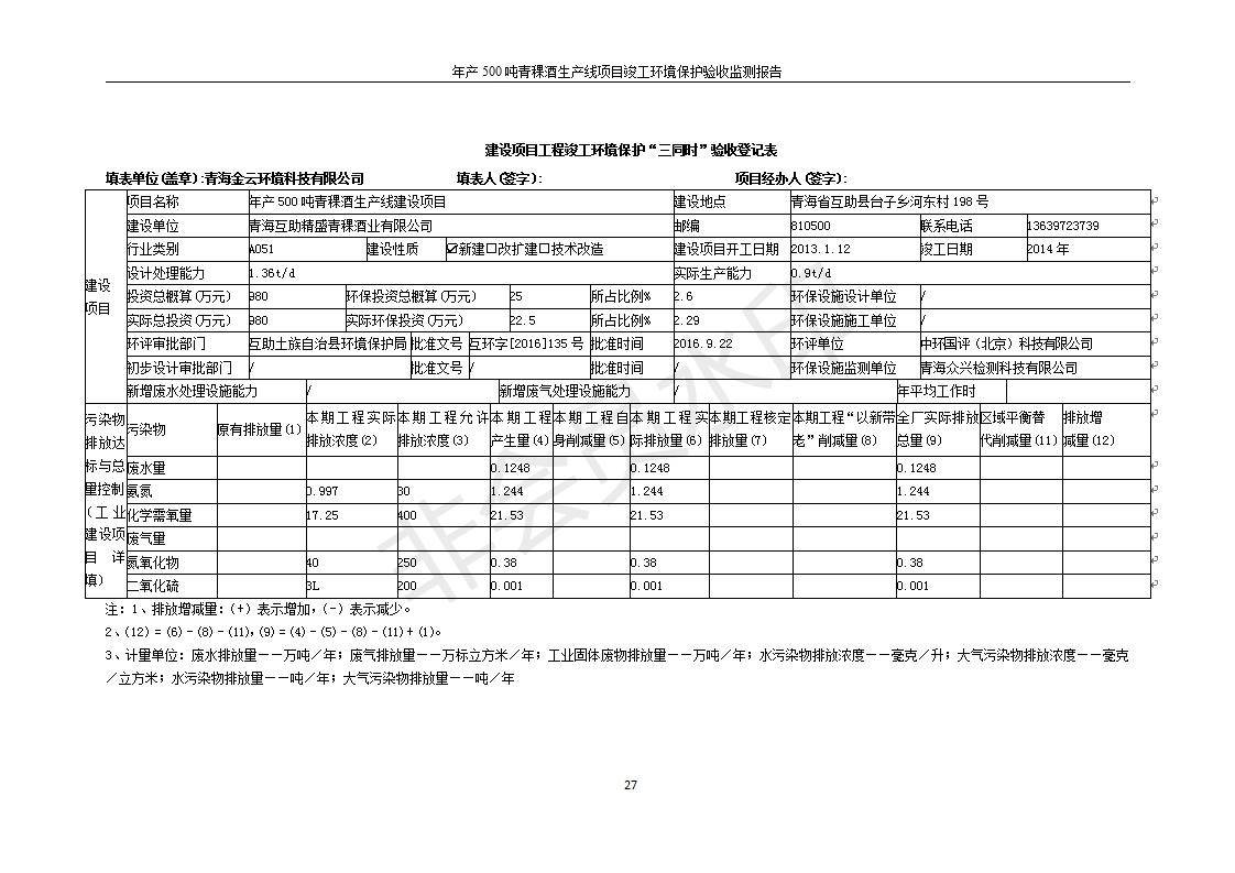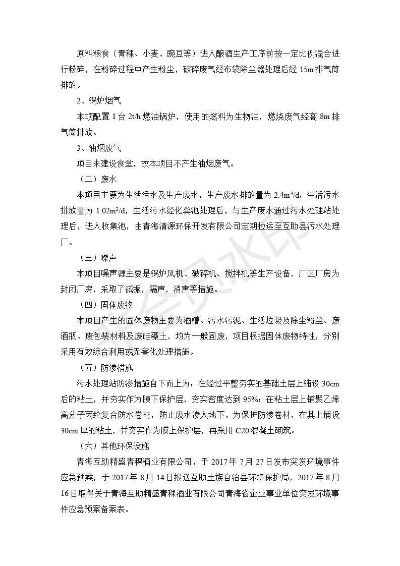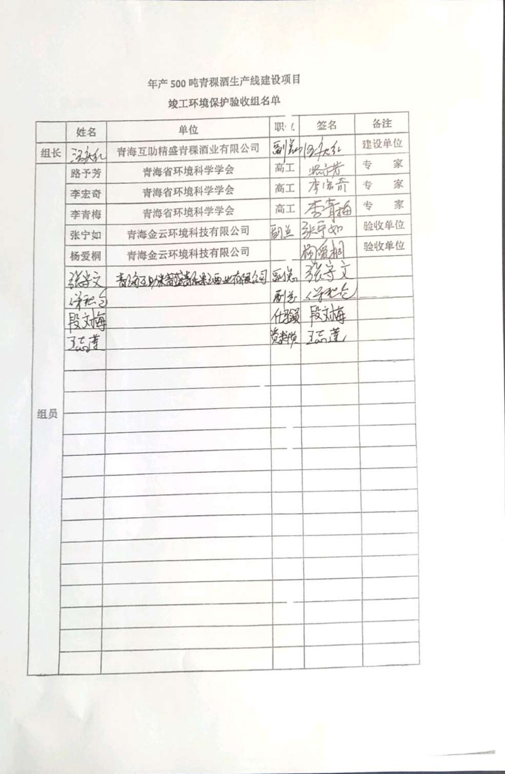 根據(jù)中華人民共和國國務(wù)院令第682號《國務(wù)院關(guān)于修改〈建設(shè)項目環(huán)境保護管理條例〉的決定》和《建設(shè)項目竣工環(huán)境保護驗收暫行辦法》(國務(wù)院令682號),綜合檢測實驗室建設(shè)項目(包括竣工環(huán)境保護驗收監(jiān)測報告表和驗收意見)公示如下。 一、項目名稱:青海互助精盛青稞酒業(yè)有限公司年產(chǎn)500噸青稞酒業(yè)生產(chǎn)線建設(shè)項目 二、地點:青海省海東市互助土族自治縣臺子鄉(xiāng)河?xùn)|村198號